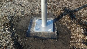 - An- und Abschlüsse /Lichtkuppel, Entlüfter, Mauerhochzüge, Attika usw.) 2-lagig abdichten mit einer 4mm und einer 5mm starke jeweils vliesarmierte Plastomerbahn. Falls erforderlich, wird vorerst ein 10 cm breiter Schleppstreifen unterlegt. So werden die hier auftretenden unterschiedlichen Dehnungen wirksam überbrückt. Die beiden Abdichtungsbahnen werden nahtversetzt verlegt in Kurzstücken in Flämmverfahren mit Nahtüberlappung und fingerförmig eingebunden in die Flächenisolierung. An der Oberkante werden die Hochzüge mechanisch befestigt mit einem Klemmprofil. Die Sichtlage ist einseitig versehen mit hellem Schiefer für zusätzlichen UV-Schutz.