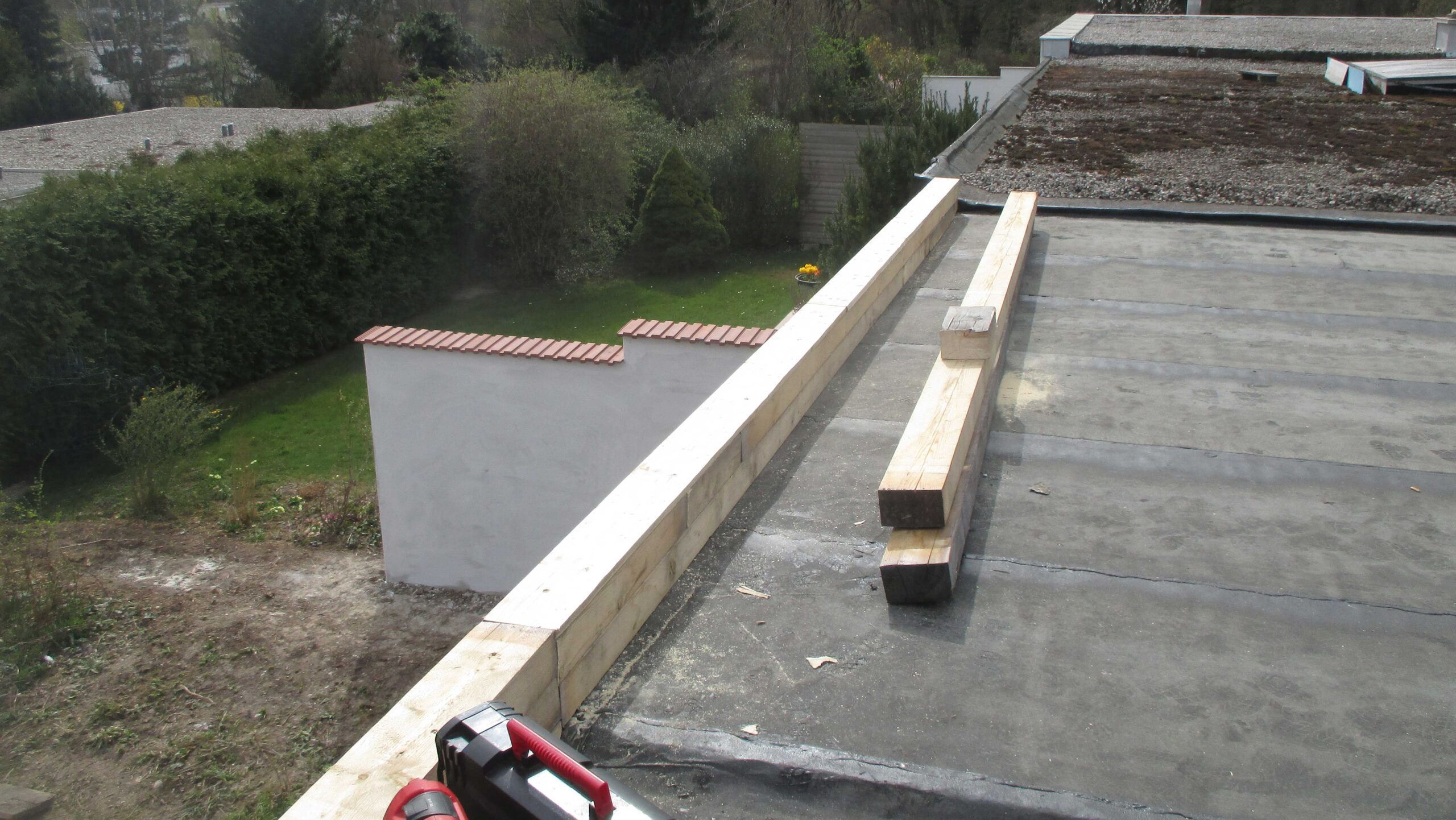 - An- und Abschlüsse /Lichtkuppel, Entlüfter, Mauerhochzüge, Attika usw.) 2-lagig abdichten mit einer 4mm und einer 5mm starke jeweils vliesarmierte Plastomerbahn. Falls erforderlich, wird vorerst ein ca. 10 cm breiter Schleppstreifen unterlegt. So werden die hier auftretenden unterschiedlichen Dehnungen wirksam überbrückt. Die beiden Abdichtungsbahnen werden nahtversetzt verlegt in Kurzstücken in Flämmverfahren mit Nahtüberlappung und fingerförmig eingebunden in die Flächenisolierung. An der Oberkante werden die Hochzüge mechanisch befestigt mit einem Klemmprofil. Die Sichtlage ist einseitig versehen mit hellem Schiefer für zusätzlichen UV-Schutz.
