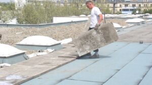 - Bereiche mit Unebenheiten, aufstehender Dachpappe händisch und/oder maschinell abscheren mit einem Dachhobel und abgetragene Pappe seitlich zwischenlagern. Anschließend wird das abgescherte Material abtransportiert und entsorgt.